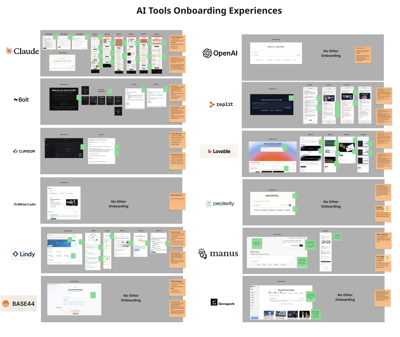 I spent 20+ hrs going through the onboarding experiences for a dozen major AI tools: Anthropic(Claude), Perplexity, OpenAI(ChatGPT), Replit, Lindy, Lovable, Manus AI, Cursor, GitHub, Genspark, Bolt and Base44/Wix.